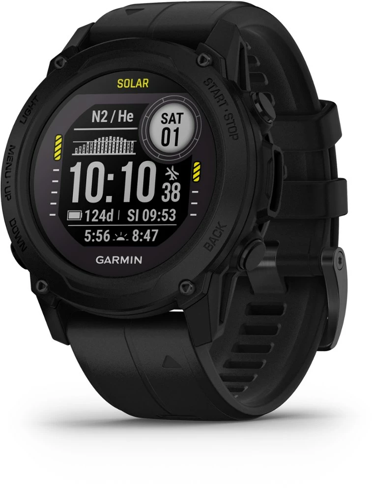 - Battery life of up to 25 hrs. in dive mode and 124 days in smartwatch mode (assumes all-day wear with 3 hrs. per day outside in 50,000 lux conditions)